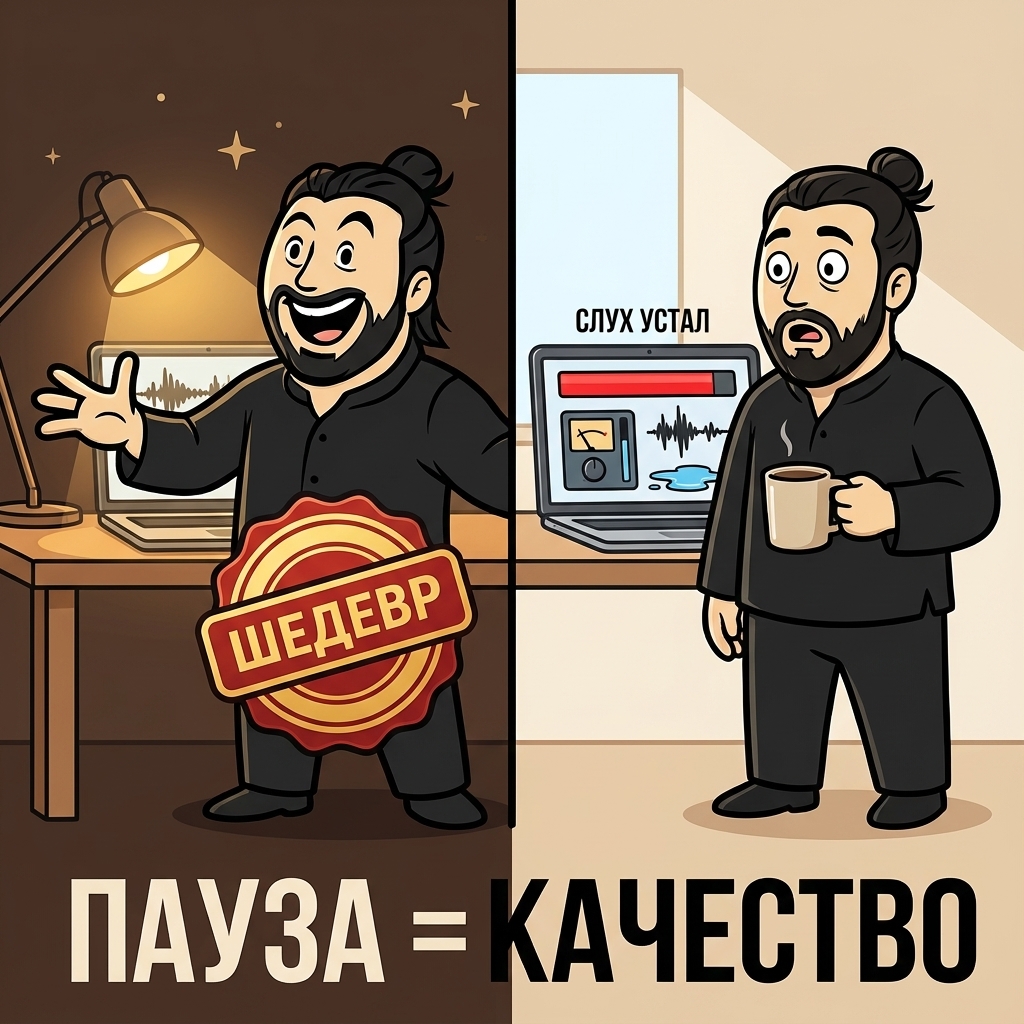 На деле всё проще: слух устает и привыкает. После пары часов ты начинаешь принимать кривизну за норму. Поэтому мы и не видим смысла сводить без остановки дольше ~2 часов: дальше легко сделать хуже и думать, что сделал лучше.